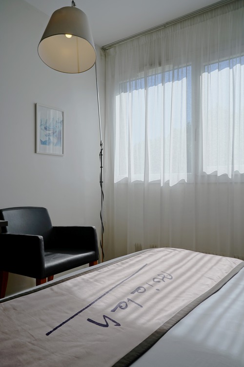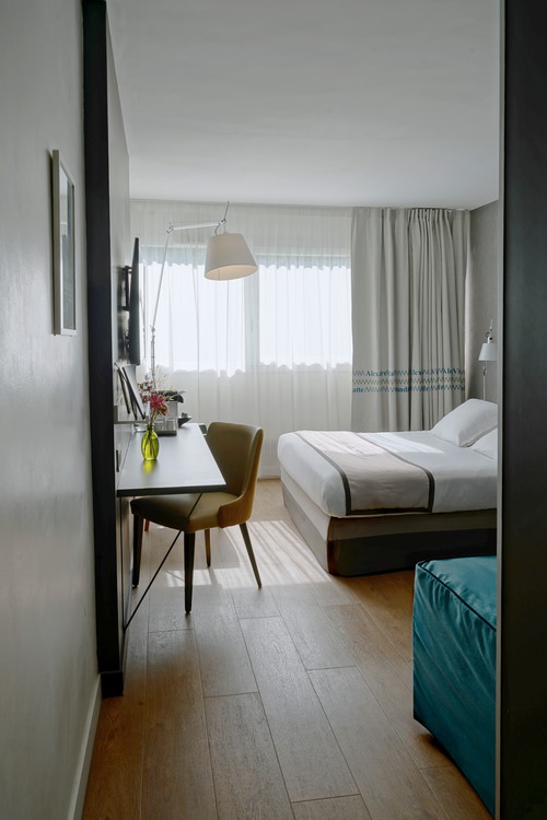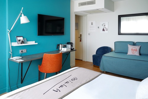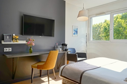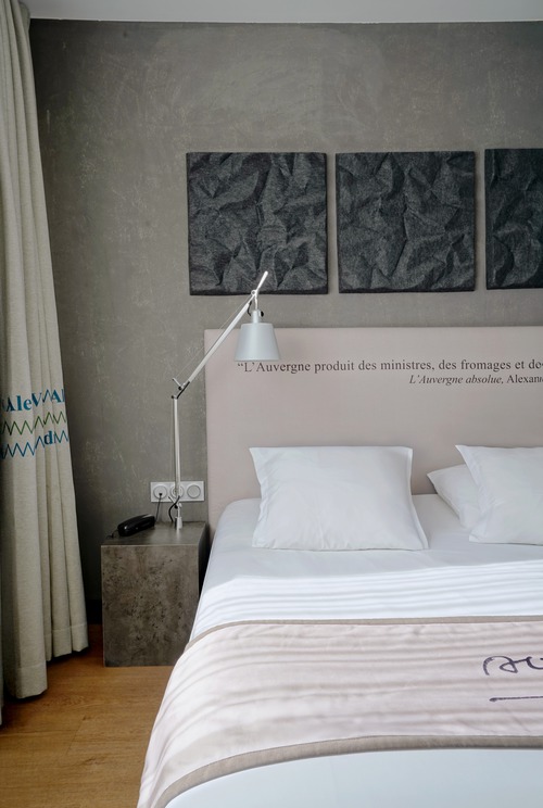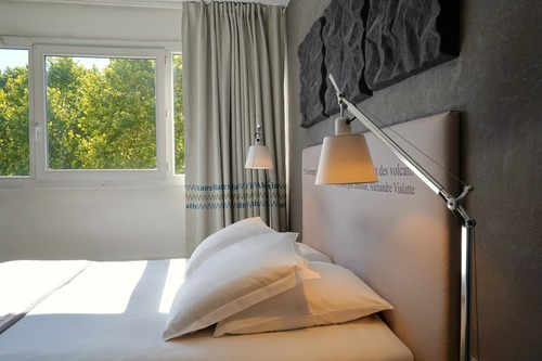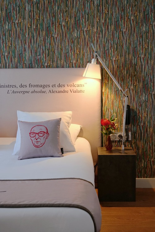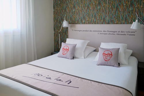 62 elegante kamers ingericht met aquarellen en citaten die verwijzen naar het oeuvre van Alexandre Vialatte. Verzorgingsproducten van Terre de Mars in de badkamer. We reserveren voor u een comfort kamer (19 m²) voor max. 2 personen.