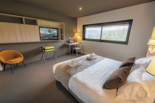 de 32 kamers bevinden zich allemaal op de gelijkvloerse verdieping met zicht op het platteland. Het veelvuldig gebruik van hout zorgt voor de link met de omringende natuur. Een- en tweepersoonskamers (22-28 m²) en familiekamers (28 m², max. 2 volwassenen en 2 kinderen, stapelbed afgescheiden van de kamer). Badjassen en pantoffels, verzorginsproducten van Sothys en Damana.