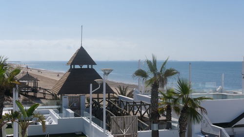 rustig, aan het strand. Op 3 km van het oude centrum, dat u te voet, per fiets of per bus (halte om de hoek) kan bereiken. Met de boot bent u in een halfuur in Cádiz. Op ca. een halfuur rijden: Jerez (sherry, Spaanse rijschool), El Puerto de Santa Maria (vissersdorpje) en het natuurpark Doñana.